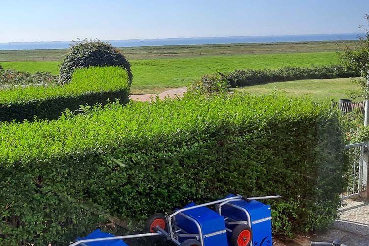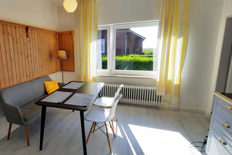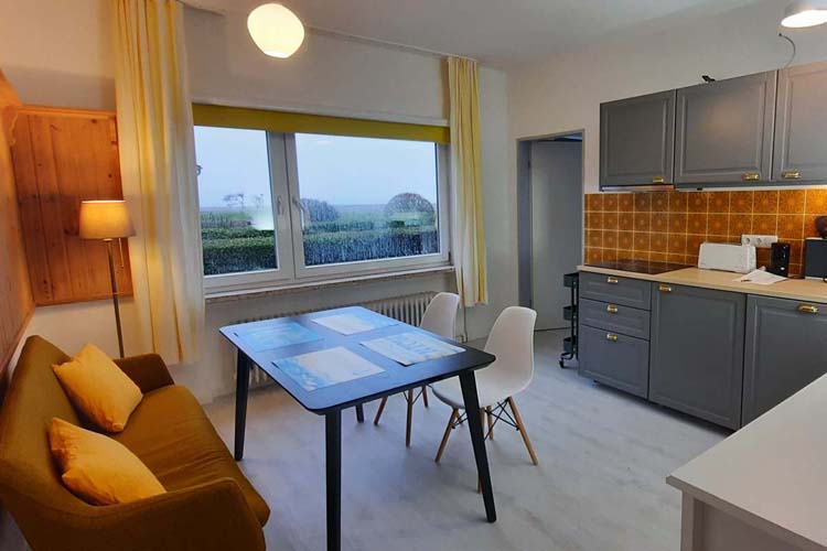 Die Wohnung „Sextant” liegt im Erdgeschoß des Haus Sternenhimmel, mit Blick aufs Wattenmeer und die Hellerwiesen. Sie hat zwei Zimmer - eine Wohnküche und ein Schlafzimmer - sowie ein kleines Tageslichtbad.